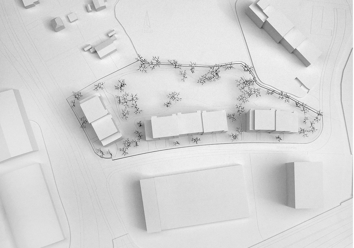 Die städtebauliche Setzung integriert die neuen Volumen in die bestehende Bebauungsstruktur und schafft gen Norden grosszügige, parkartige Freiräume mit Sichtbezug und aussenräumlichen Nutzungsmöglichkeiten für alle Wohnungen. Der nördliche Bachlauf und das Naherholungsgebiet tragen wesentlich zur Wohnqualität des Areals bei.